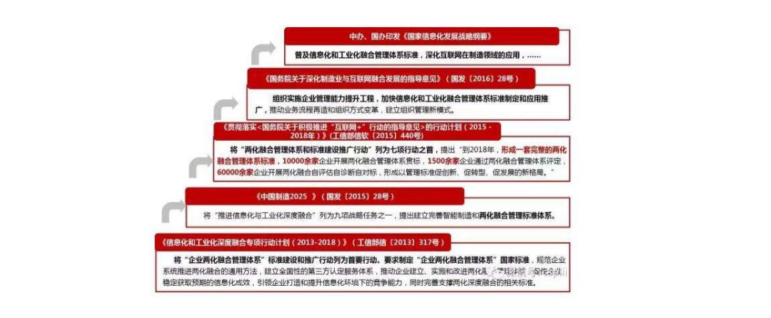 十六大提出:“以信息化带动工业化,以工业化促进信息化”;十八大提出:“促进工业化、信息化、城镇化、农业现代化同步发展”;十九大提出:“推动互联网、大数据、人工智能和实体经济深度融合”两化融合管理体系是企业系统地建立、实施、保持和改进两化融合过程管理机制的通用方法,覆盖企业全局,可帮助企业依据为实现自身战略目标所提出的需求,规范两化融合相关过程,并使其持续受控,以形成获取可持续竞争优势所要求的信息化环境下的新型能力。德国提出了“工业4.0”,引领全球制造业潮流,是强大的机械工业制造基础也是嵌入式以及控制设备的先进技术和能力。而我国提出“中国制造2025”,制造大国向制造强国转型,以加快新一代信息技术与制造业深度融合为主线,推进智能制造为主攻方向。国家采用两化融合管理体系的方法全面提升企业两化融合的水平。也就是企业贯彻落实GB/T 23020《工业企业信息化和工业化融合评估规范》的过程。